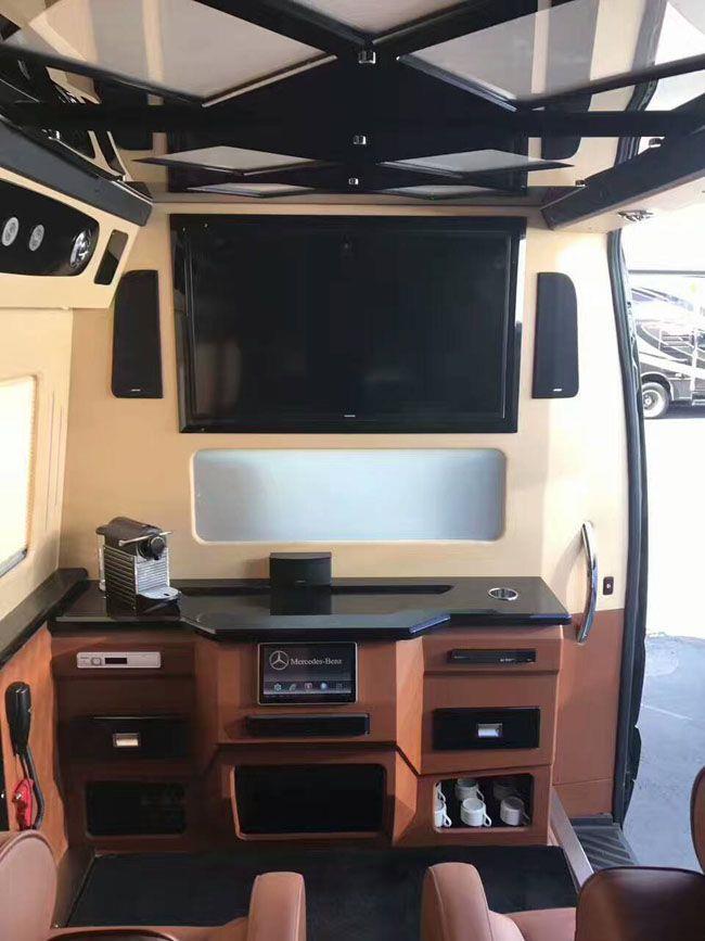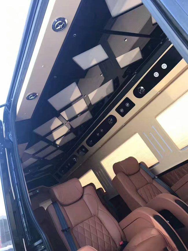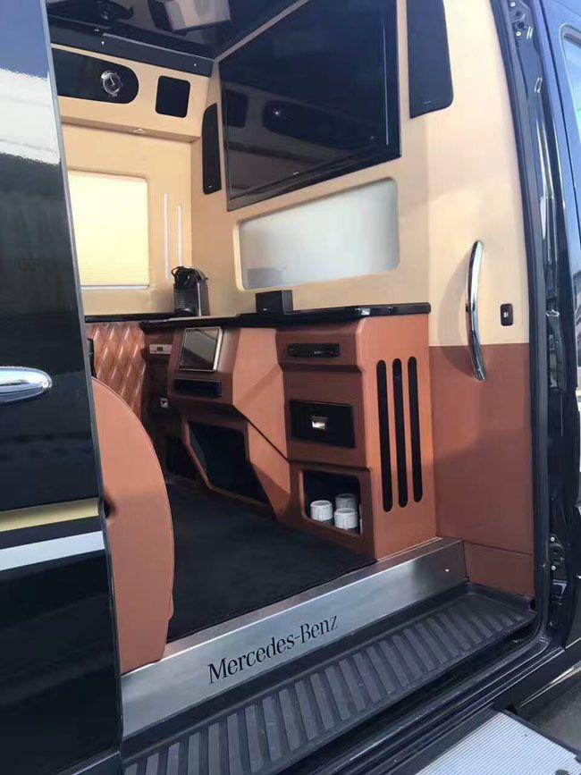进口奔驰斯宾特车内大面积真皮包裹,前后排座椅均可向后大角度放倒,方面躺着休息,前后排均有触控屏幕,电动窗帘、全自动隐藏吧台、可升降高清液晶显示器、boss音响等等通过控制屏均可操作,另外还配备了可拆卸的办公桌。可办公,可娱乐,可拆卸——节约空间的同时也提高了乘客舱的高逼格。