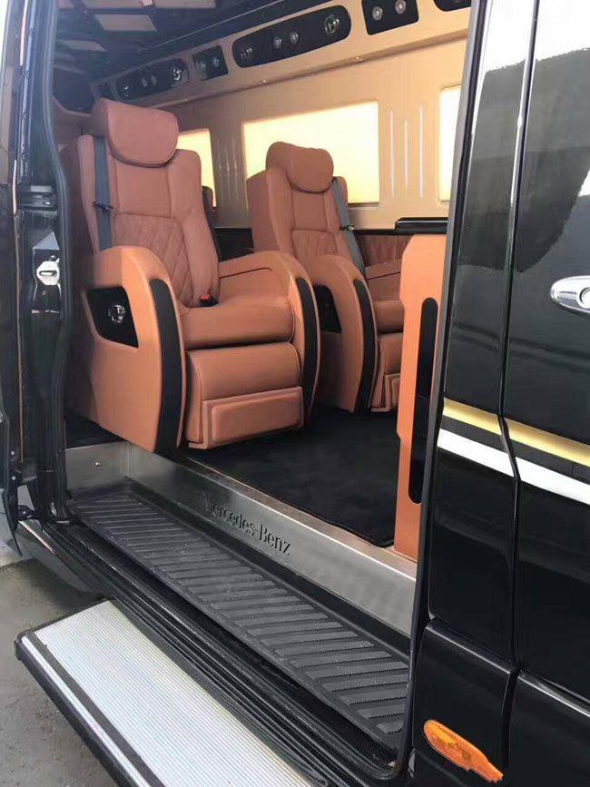 纯进口奔驰斯宾特的内饰座椅配色十分美观大气,两个全自动隐藏座椅,一个全自动吧台可以供乘客打牌娱乐,另外吧台的桌面也是真皮铺设的,非常美观结实耐用。奔驰斯宾特前排座椅为航空机按摩座椅,可以360度旋转,将后排座椅放平之后就是可以供3个成年人休息的床铺啦。休息之余还可以按摩放松,缓解您的乘车疲劳。